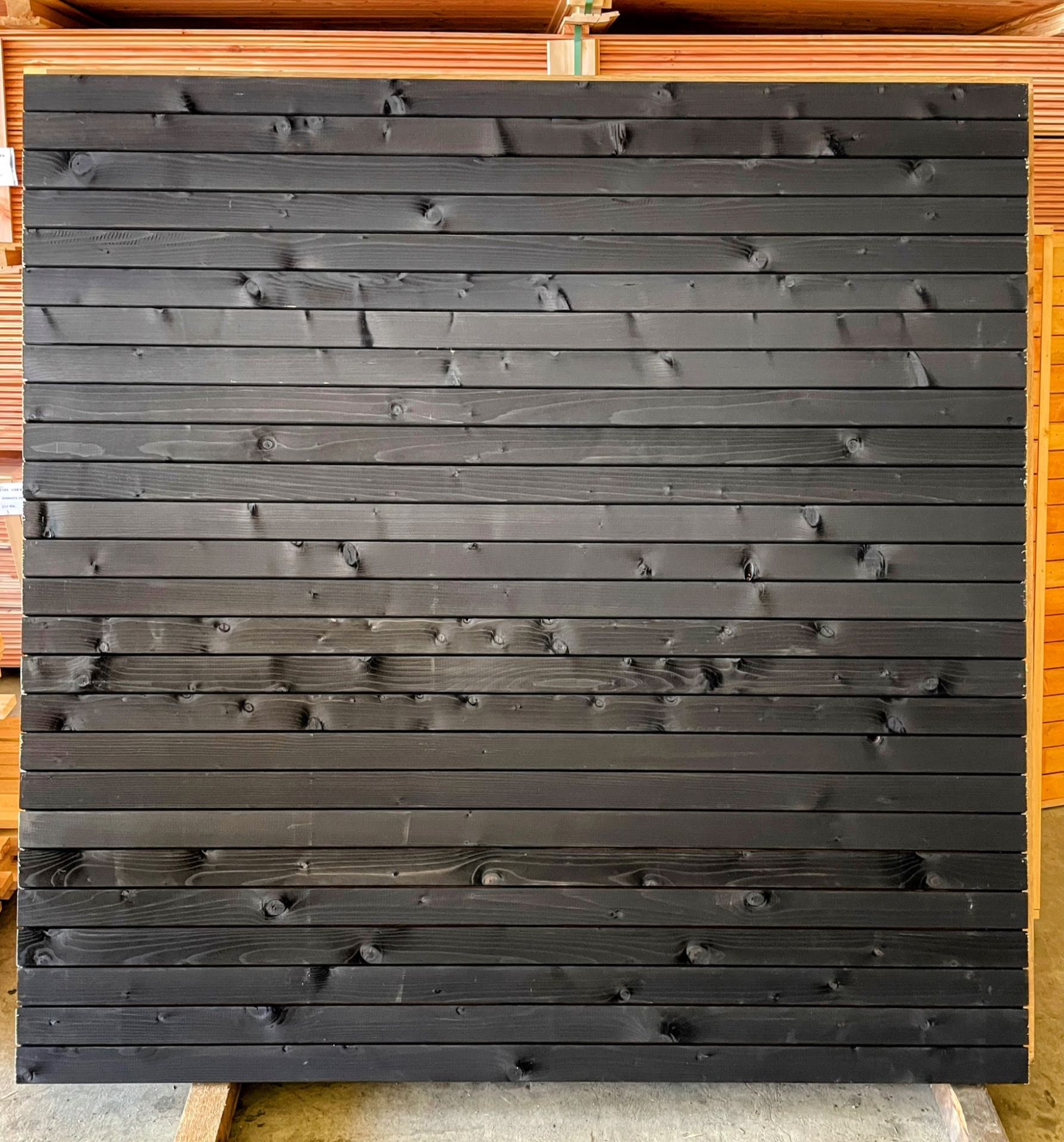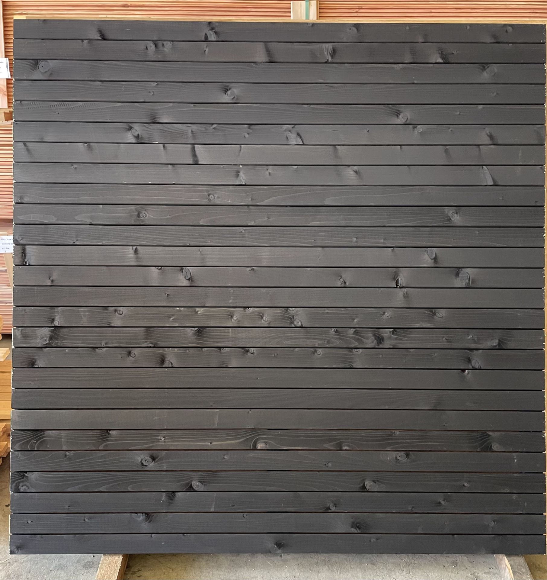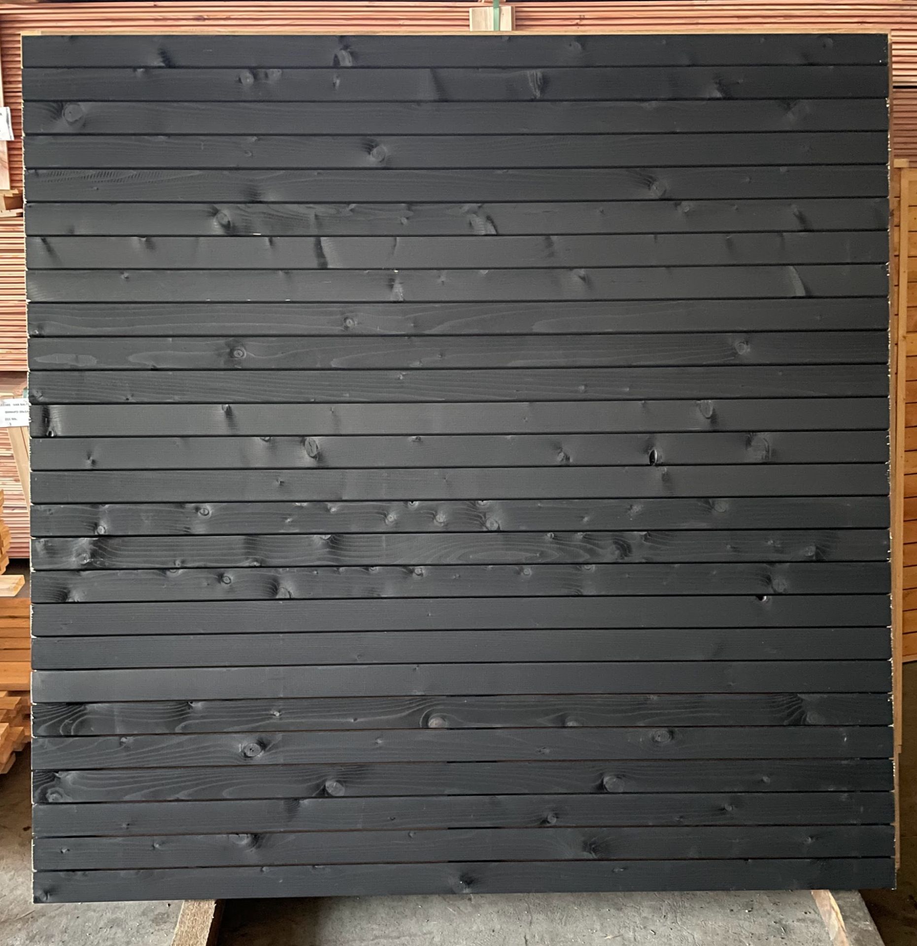 Fencing Panels made from Scandinavian Spruce 20mm thick black slats – Fencing panels can be install vertical and horizontal. Build from 20mm thickness 70mm width battens with 5mm gap.