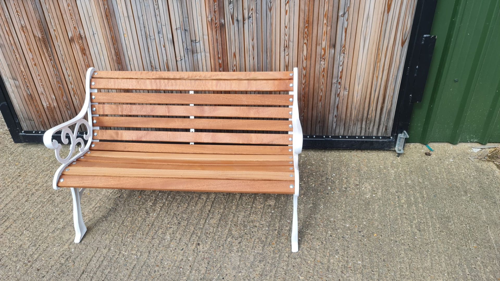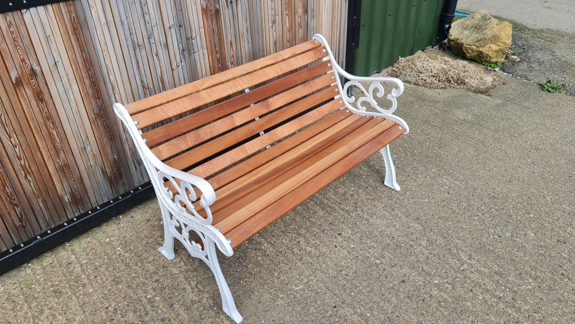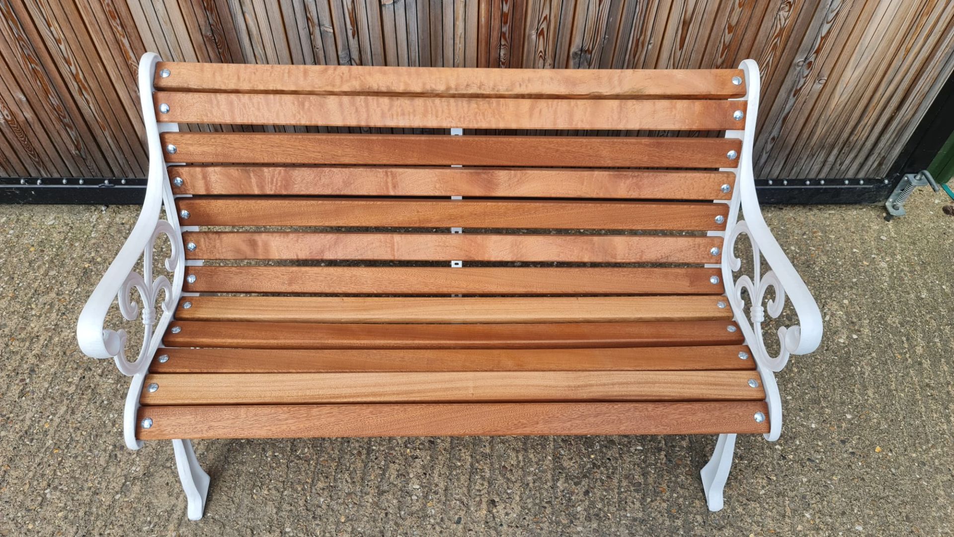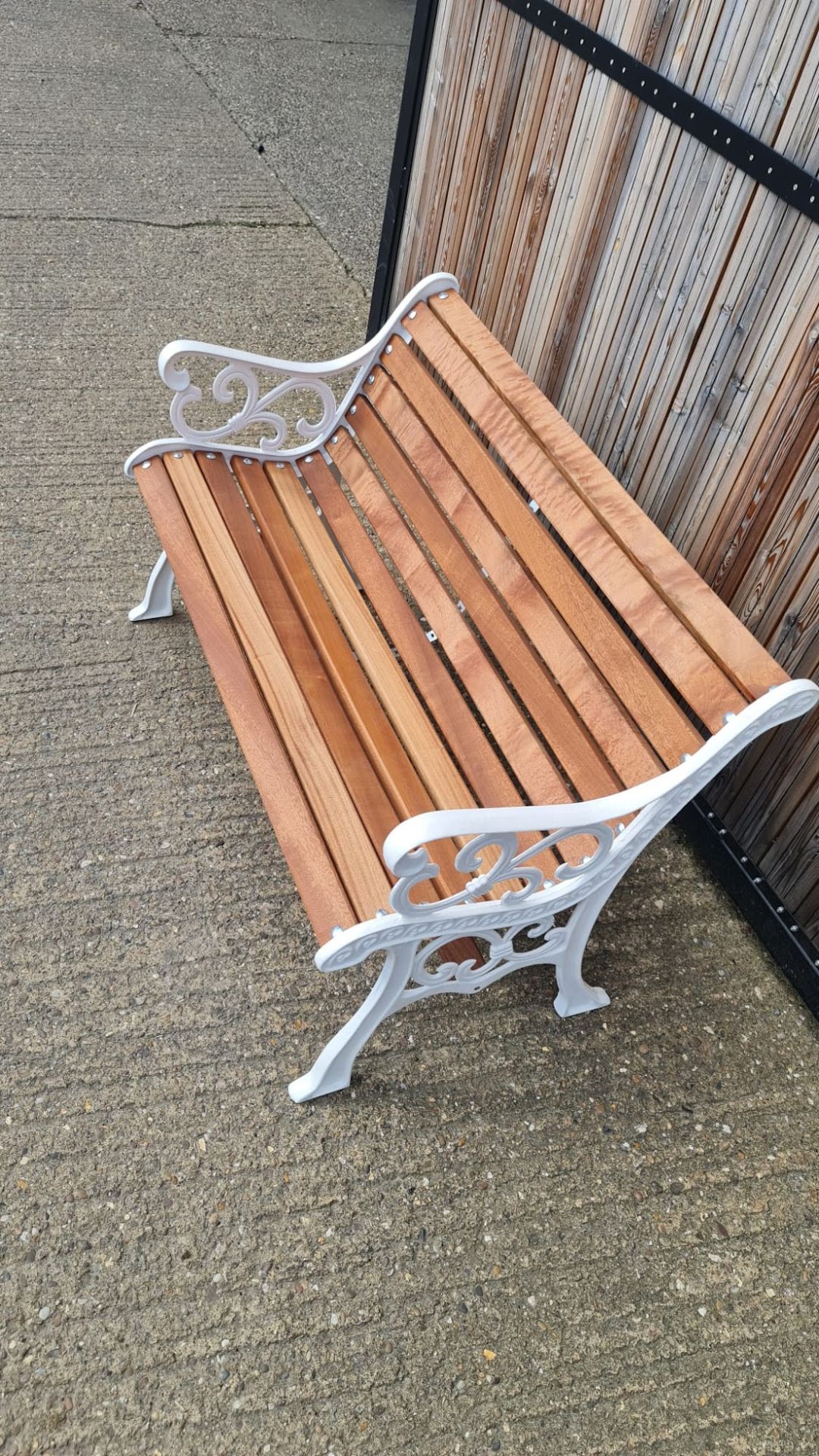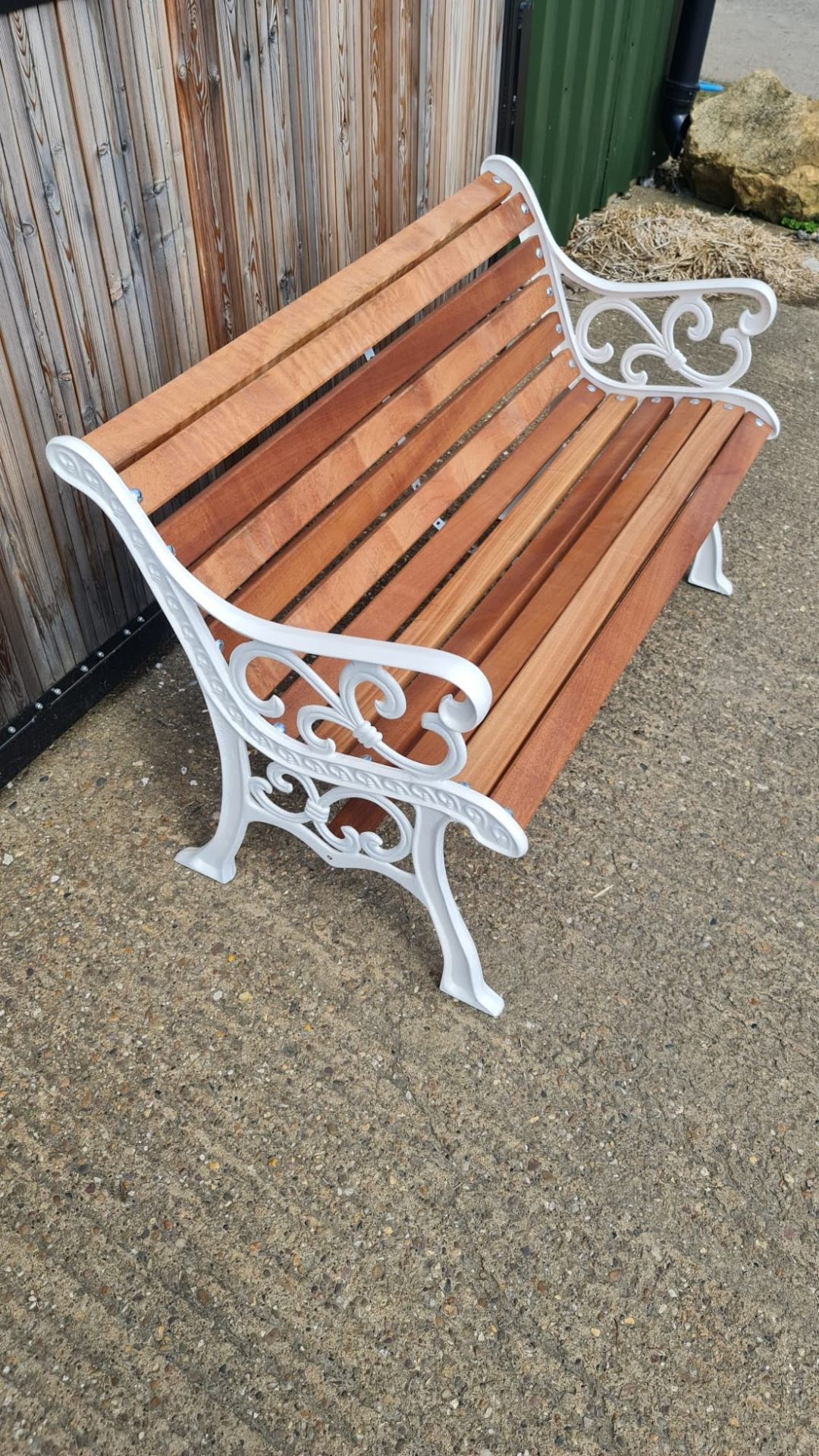 Refurbished Iron Cast White Garden Patio Bench made from Sapele timber is perfect for garden patios, parks, or outdoor seating areas, combining functionality with a classic design that adds a charming touch to any outdoor space. The iron cast frame is low-maintenance, requiring occasional cleaning and possibly re-coating for rust protection. The oak wood may need periodic treatment with wood oil or sealant to maintain its appearance and resist weather damage.