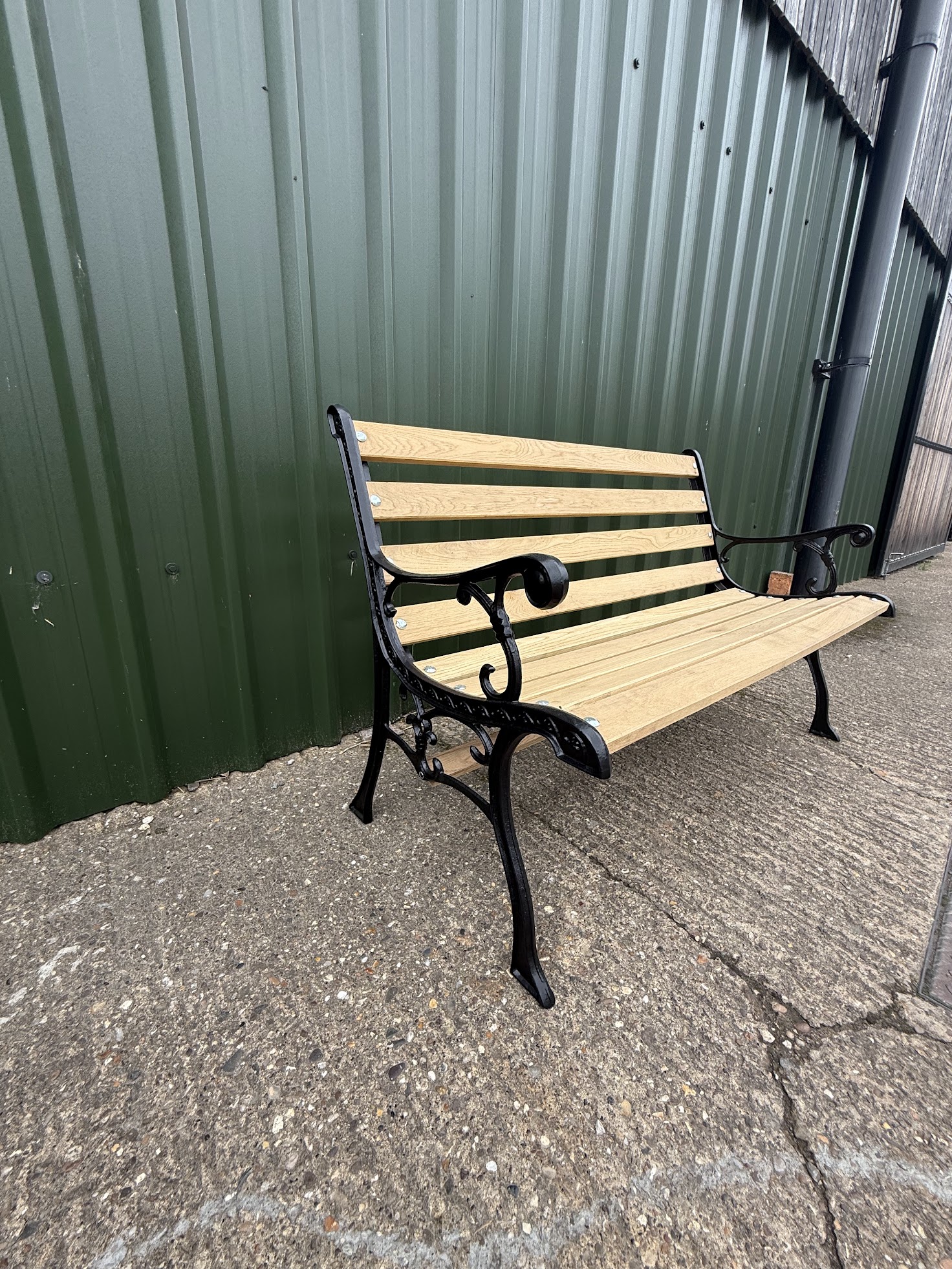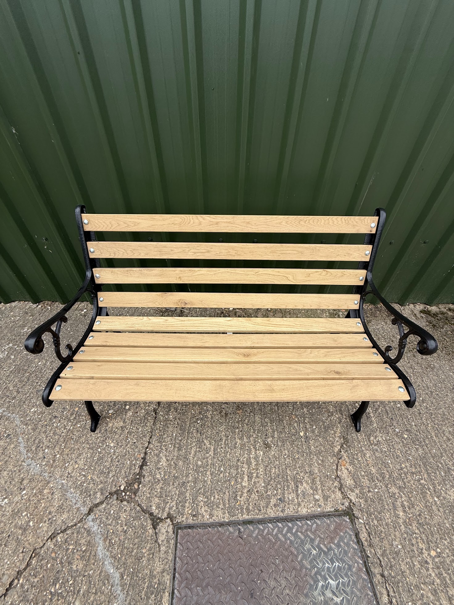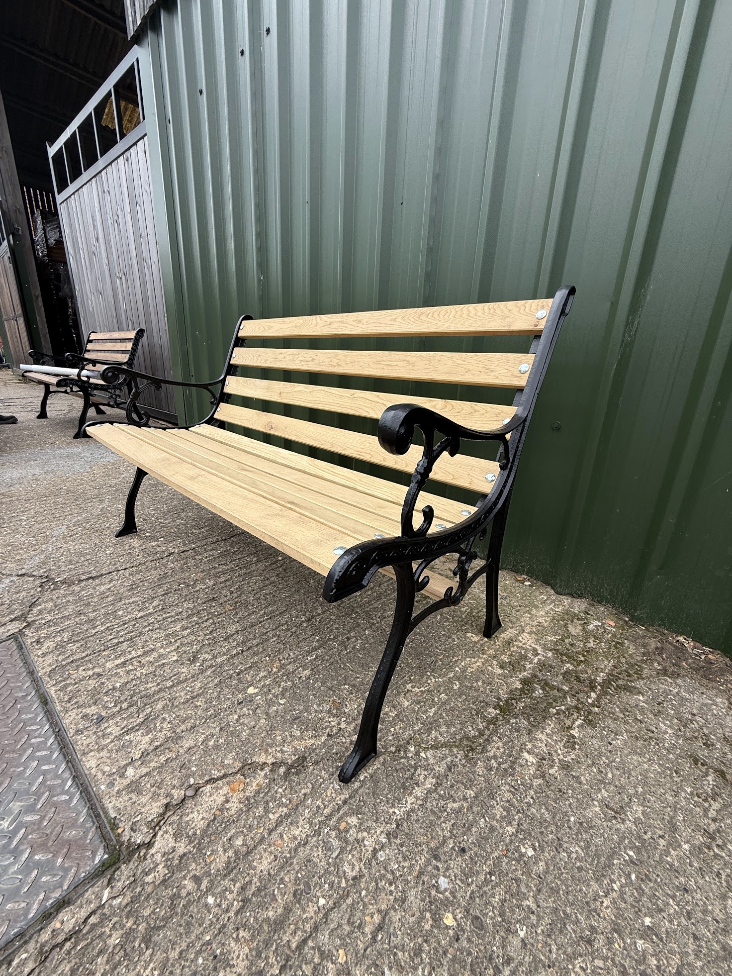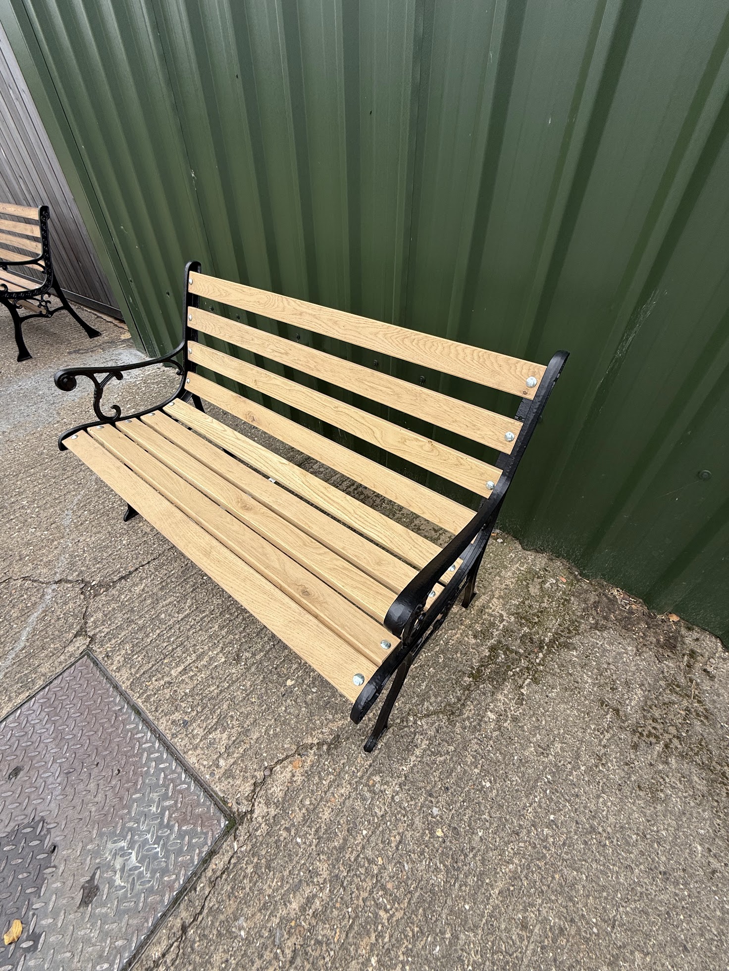 Refurbished Iron Cast Black Garden Patio Bench, parks, or outdoor seating areas, combining functionality with a classic design that adds a charming touch to any outdoor space. The iron cast frame is low-maintenance, requiring occasional cleaning and possibly re-coating for rust protection. The oak wood may need periodic treatment with wood oil or sealant to maintain its appearance and resist weather damage.