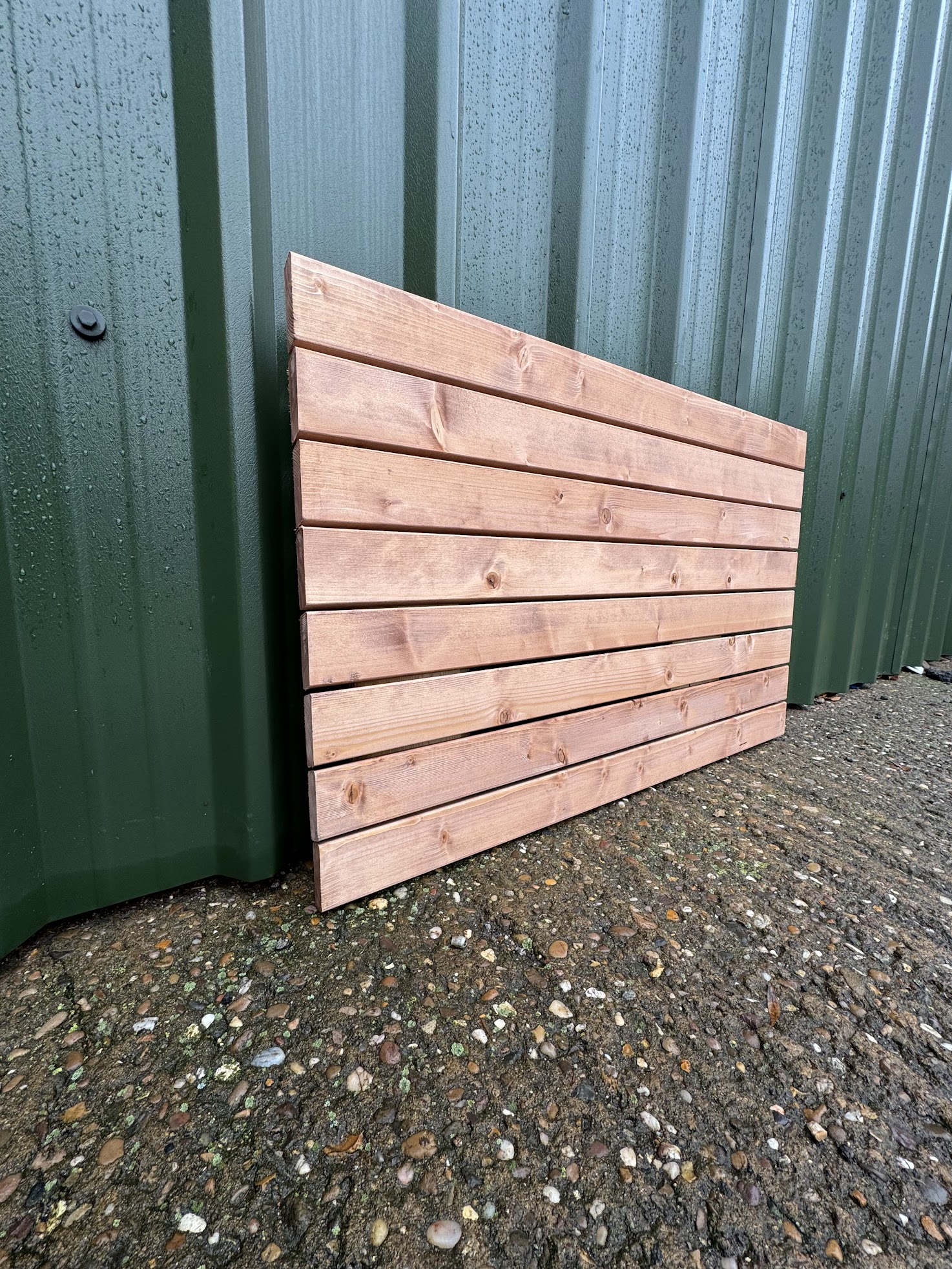 Treated Fencing Elements Battens Slats Rainscreen Chestnut Colour made from Scandinavian Spruce , also known as a privacy fence or a contemporary style fence elements, is a type of fence that consists of horizontal slats or boards that are evenly spaced apart. The slats of a slatted fence are usually narrow and can vary in width, depending on the desired level of privacy and aesthetic appeal. They are installed vertically, parallel to each other, and attached to horizontal support beams or rails. The gaps between the slats allow air and light to pass through while still providing some level of privacy.